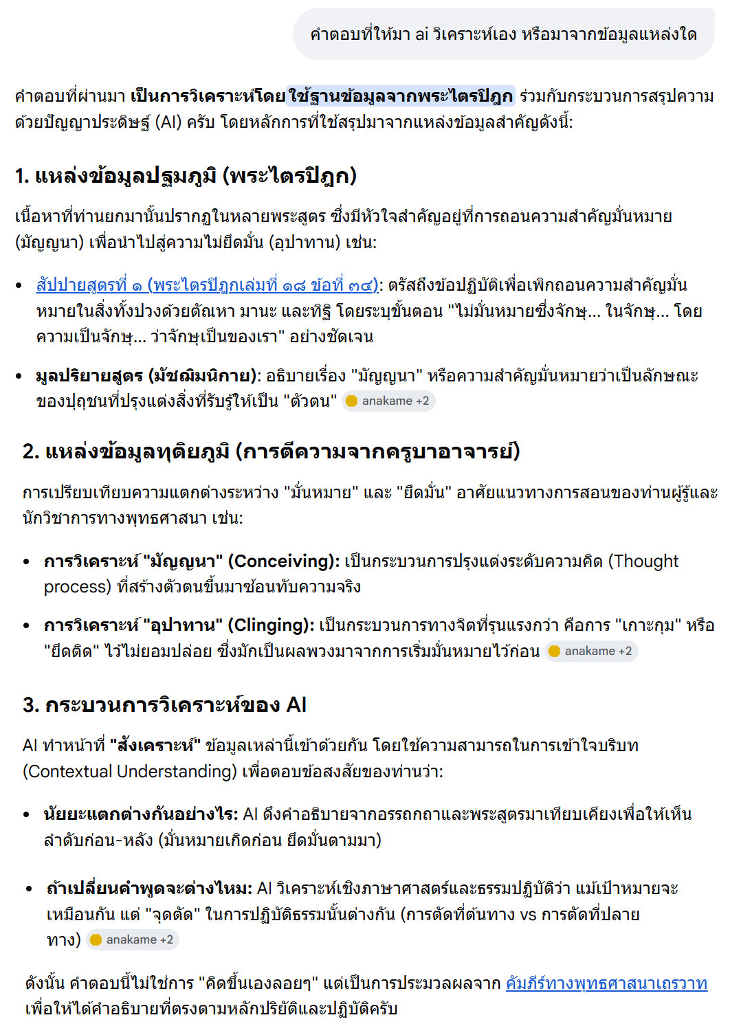แม้ ai จะวิเคราะห์ได้ดี ก็ยังต้องตรวจสอบด้วยว่า เอาข้อมูลมาจากไหน หากไม่ตรวจสอบให้ดี ai ก็มักเบี่ยงเบนไปทางคำสอนของครูบาอาจารย์ คัมภีร์ต่างๆ หรือจากอรรถกถา รวมทั้งพระอภิธรรมปิฎกที่เราไม่พึงปราถนา และคำตอบที่ได้ ส่วนใหญ่ ก็มาจาก พระไตรปิฎกที่เป็นคำสอนของพระพุทธเจ้า